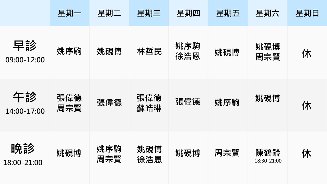 - 【週一至週六】早診09:00-12:00午診14:00-17:00晚診18:00-21:00★週日全日休診
