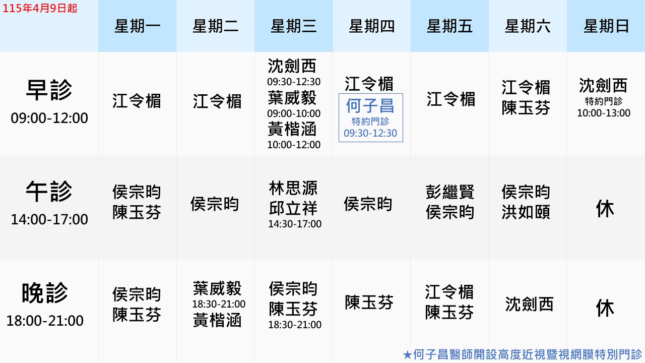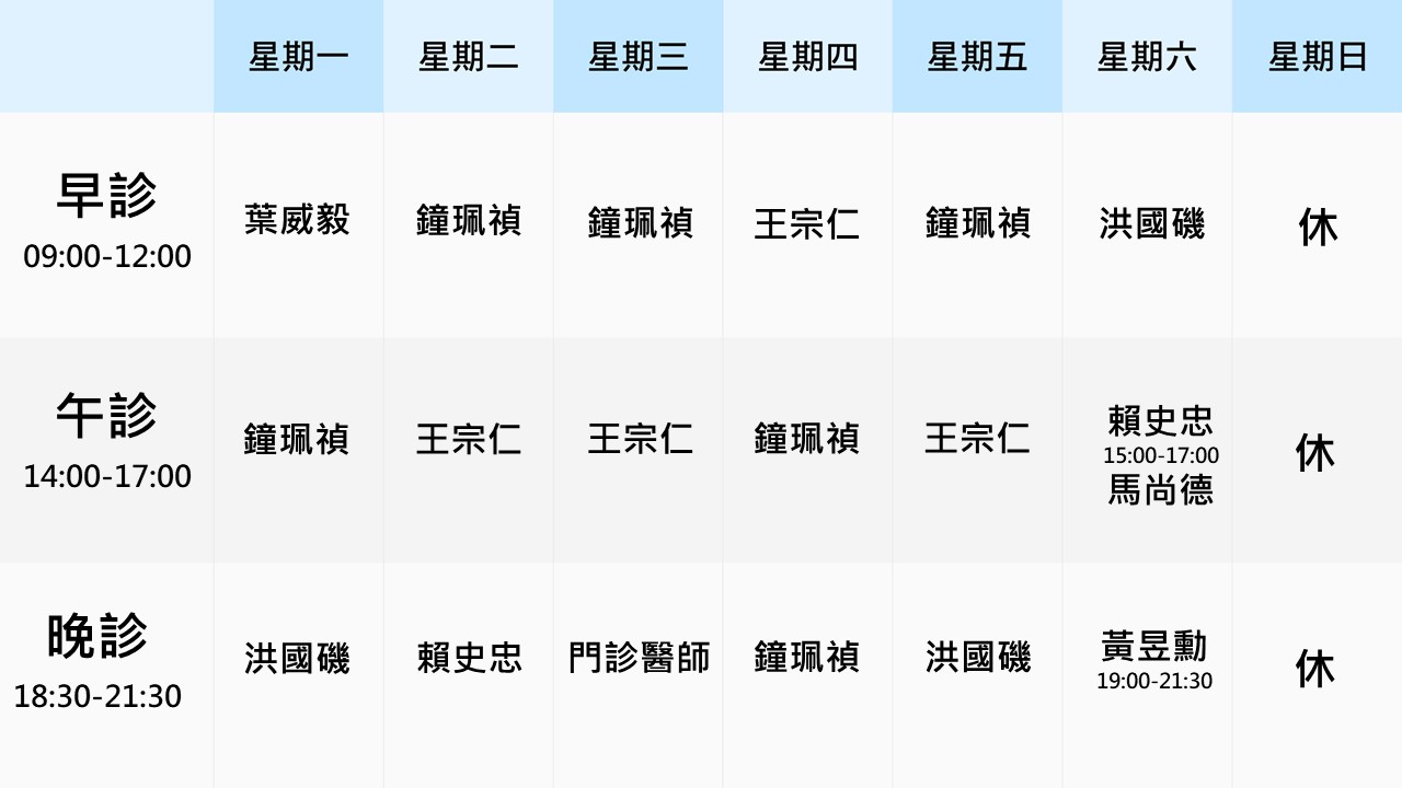 * 此門診資訊僅供參考,煩請於就診前電洽詢問!